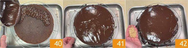 Wenn die Ganache eine Temperatur von etwa 50 Grad erreicht hat, gießen Sie sie über den Kuchen 40 und schütteln Sie das Gitter, um die Glasur gleichmäßig zu verteilen 41. Zum Schluss garnieren Sie mit Haselnusskrokant, das Sie ringsum verteilen 42.