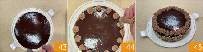 Heben Sie den Kuchen mit zwei Spateln auf die Servierplatte und lassen Sie die Glasur für etwa eine halbe Stunde im Kühlschrank fest werden 43. Geben Sie die übrige Creme in einen Spritzbeutel mit gezackter Tülle und spritzen Sie kleine Tupfen zur Dekoration 44. Ihr gefüllter Haselnuss-Schokoladenkuchen ist fertig 45.