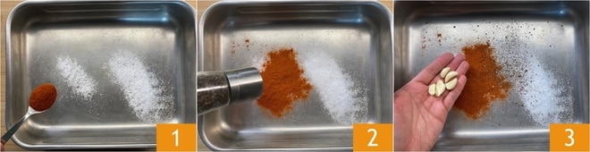 Um den hausgemachten Kebab zuzubereiten, bereiten Sie zuerst die Marinade für das Fleisch vor: Geben Sie Salz, Paprika 1, Pfeffer 2 und die geschälten und leicht zerdrückten Knoblauchzehen 3 in eine große Auflaufform.