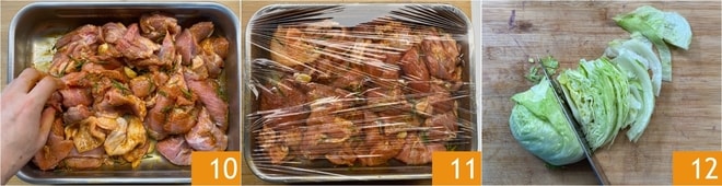 Massieren Sie das Fleisch mit den Händen, um es gleichmäßig mit der Marinade zu würzen 10, dann decken Sie es mit Frischhaltefolie ab und lassen Sie es mindestens 4 Stunden im Kühlschrank marinieren 11. Gegen Ende der Marinierzeit kümmern Sie sich um das Gemüse: Waschen Sie den Salat und schneiden Sie ihn in Streifen 12.