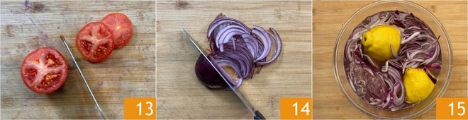 Waschen und schneiden Sie auch die Tomaten in Scheiben 13. Schälen Sie die Zwiebel und schneiden Sie sie fein 14, dann legen Sie sie in eine Schüssel mit Wasser, Eis und dem Saft von 2 Zitronen, um ihren scharfen Geschmack zu mildern 15.