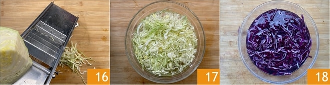 Schließlich schneiden Sie den Weißkohl mit einem Gemüsehobel 16 und legen ihn in kaltes Wasser 17. Machen Sie dasselbe mit dem Rotkohl 18.