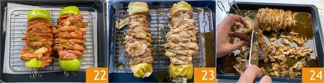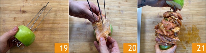 Nehmen Sie das Fleisch aus dem Kühlschrank. Nehmen Sie einen Apfel und entfernen Sie den unteren und oberen Teil, dann teilen Sie ihn horizontal in zwei Hälften. Stecken Sie 3 Edelstahlspieße in eine halbe Apfelhälfte 19, dann spießen Sie die Fleischscheiben auf die Spieße und wechseln Hähnchen mit Kalbfleisch ab 20. Wenn Sie fertig sind, schließen Sie den Spieß mit der anderen halben Apfelhälfte 21. Verfahren Sie genauso, um den zweiten Spieß zu formen.
