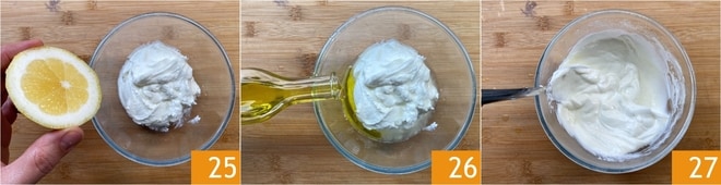 Zum Schluss bereiten Sie die Joghurtsauce vor: Geben Sie das griechische Joghurt in eine Schüssel, fügen Sie dann den Zitronensaft 25 und das Öl 26 hinzu und mischen Sie gut 27. Wenn Sie möchten, können Sie auch ein paar Tropfen Tabasco hinzufügen.