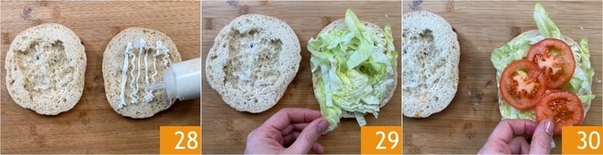 Jetzt lassen Sie das Gemüse abtropfen und trocknen es, dann sind Sie bereit, Ihren Kebab zusammenzusetzen: Schneiden Sie die Pita in zwei Hälften und bestreichen Sie eine Seite mit Joghurtsauce 28, dann fügen Sie den Salat 29 und die Tomaten 30 hinzu.