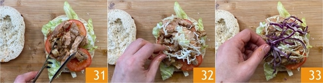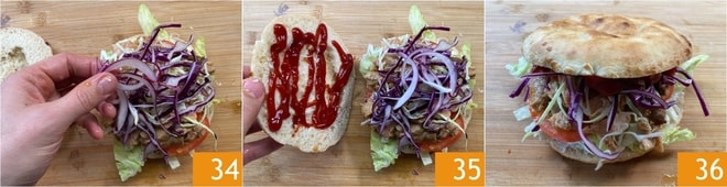 Vervollständigen Sie mit der roten Zwiebel 34, dann schließen Sie mit der anderen Hälfte des Brötchens, das mit Ketchup bestrichen ist 35. Verfahren Sie genauso, um auch alle anderen Brötchen zusammenzustellen. Ihr hausgemachter Kebab ist bereit zum Genießen 36!