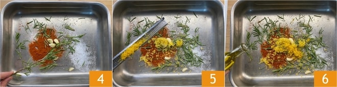 Fügen Sie die Rosmarinzweige 4, die abgeriebene Zitronenschale 5 und das Öl 6 hinzu.