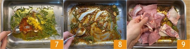 Geben Sie auch den gemahlenen Kreuzkümmel und Koriander 7 hinzu, vermischen Sie alles 8 und legen Sie die Hähnchen- und Kalbfleischscheiben hinein 9.