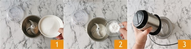 Um hausgemachten Puderzucker zuzubereiten, benötigen Sie einen sehr leistungsstarken Mixer mit Klingen. Geben Sie den Zucker 1 und die Maisstärke 2 hinein. Mixen Sie alles etwa 2 Minuten lang 3. Dann stoppen Sie, um die Klingen abkühlen zu lassen, und mixen Sie noch ein paar Minuten weiter.
