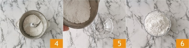 Zu diesem Zeitpunkt haben Sie ein feines, luftiges und fühlbares Pulver erhalten 4. Überführen Sie es in eine Schüssel 5 und der Puderzucker ist fertig 6.