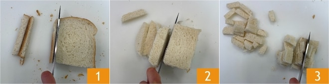 Um das hausgemachte Panko herzustellen, entfernen Sie zunächst die Kruste vom Toastbrot 1, dann schneiden Sie die Krume in Stücke 2 3.