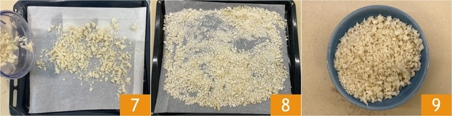 Verteilen Sie die Brotkrümel auf einem mit Backpapier ausgelegten Blech und achten Sie darauf, sie gleichmäßig zu verteilen 7. Backen Sie sie im Umluftofen bei 120°C für 5 Minuten: Nach dieser Zeit ist das Panko hell und trocken, aber noch etwas weich. Lassen Sie es vollständig auf dem Blech abkühlen 8, dann ist Ihr hausgemachtes Panko bereit zur Verwendung 9!