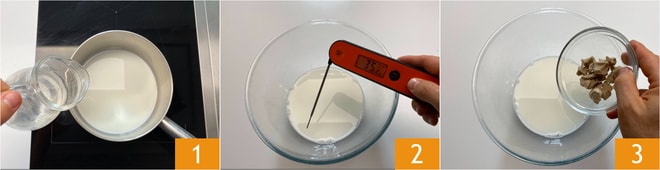 Um die Heidelbeer-Schnecken zuzubereiten, geben Sie Milch und Wasser in einen Topf 1, erhitzen Sie es auf 35° 2 und geben Sie die zerbröckelte Hefe hinzu 3.