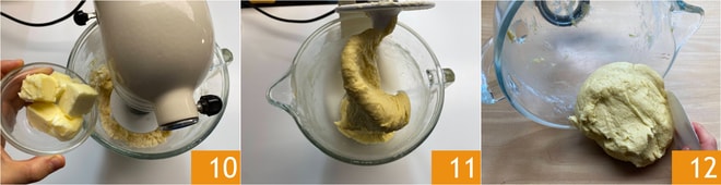 Integrieren Sie die Butter 10 und lassen Sie den Knethaken für 3-4 Minuten arbeiten, bis der Teig sich verbunden hat 11. Übertragen Sie die Mischung auf eine leicht bemehlte Arbeitsfläche 12.