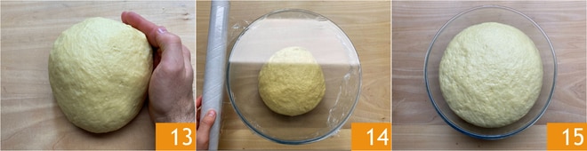 Arbeiten Sie den Teig, bis er glatt ist, formen Sie einen Teigball 13 und legen Sie ihn in eine Schüssel. Bedecken Sie ihn mit Frischhaltefolie 14 und lassen ihn im ausgeschalteten Ofen mit eingeschaltetem Licht für etwa 2 Stunden gehen. Er sollte sein Volumen verdoppeln 15.