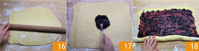 Rollen Sie den Teig auf einer leicht bemehlten Arbeitsfläche zu einem Rechteck von etwa 50 x 35 cm aus 16. Verstreichen Sie die Konfitüre 17 und rollen Sie den Teig von der langen Seite her auf 18.