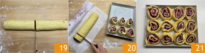 Teilen Sie die Rolle in der Mitte 19 und legen Sie sie auf ein mit Frischhaltefolie bedecktes Tablett, kühlen Sie es für eine halbe Stunde im Kühlschrank. Schneiden Sie die zwei Rollen, um 12 Schnecken zu erhalten 20, legen Sie sie auf ein mit Backpapier belegtes Blech von 28 x 21 cm 21, bedecken Sie es mit Frischhaltefolie und lassen Sie sie eine Stunde gehen. Backen Sie sie im vorgeheizten statischen Ofen bei 200° für etwa 20 Minuten.
