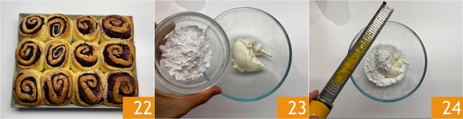 Holen Sie die Schnecken aus dem Ofen und lassen Sie sie abkühlen 22. Bereiten Sie inzwischen das Frosting vor: In eine Schüssel geben Sie den Frischkäse, den Zucker 23 und die Zitronenschale 24.