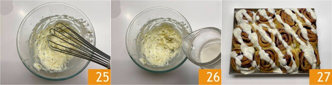 Vermischen Sie alle Zutaten mit einem Schneebesen 25 und fügen Sie die Milch langsam hinzu, bis Sie eine glatte Konsistenz erhalten. Bestreichen Sie die Heidelbeer-Schnecken mit dem Guss 27 und servieren Sie sie.