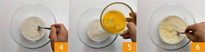 Rühren Sie, um sie aufzulösen 4, dann fügen Sie die Eier hinzu 5 und schlagen Sie, um die Mischung zu vereinen 6.