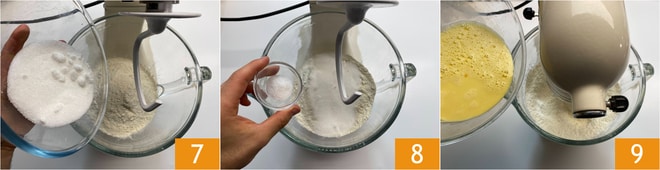 In die Schüssel der Küchenmaschine geben Sie Mehl, Zucker 7 und Salz 8. Schalten Sie den Knethaken auf niedriger Geschwindigkeit 1 -1,5 ein und fügen Sie Vanille hinzu. Gießen Sie die noch warme Mischung dazu 9.