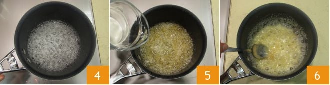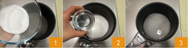 Um die heiße Schokolade mit Milch vorzubereiten, beginnen Sie mit dem Karamell: Geben Sie den Zucker 1 und das Wasser (2-3) in einen Topf mit dickem Boden,
