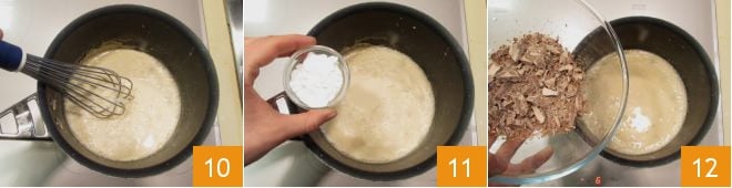 und rühren Sie ständig mit einem Schneebesen 10, dann geben Sie auch das Maisstärke hinzu 11. Bringen Sie es zum Kochen und die Mischung wird in wenigen Augenblicken eindicken. Schalten Sie dann die Hitze ab und fügen Sie die gehackte Schokolade hinzu 12.