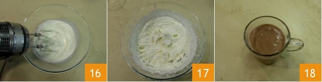 Schlagen Sie die Sahne mit einem Schneebesen auf (16-17) und füllen Sie sie in einen Spritzbeutel. Gießen Sie die Schokolade in eine Tasse 18