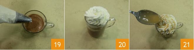 und garnieren Sie mit der Schlagsahne (19-20) und einem Löffel der zuvor beiseitegestellten Karamellsauce 21. Ihre heiße Karamell-Schokolade ist servierbereit!