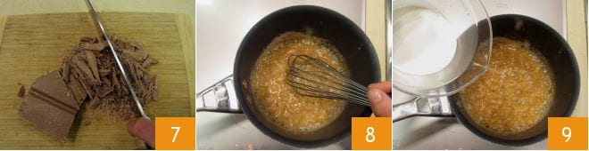 Hacke die Milchschokolade 7. Stellen Sie den Topf mit der restlichen Karamellsauce bei mittlerer Hitze zurück auf den Herd 8 und fügen Sie die Milch hinzu 9,