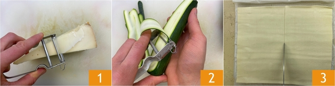 Um die herzhafte Blätterteig-Colomba zuzubereiten, beginnt damit, mit einem Sparschäler dünne Scheiben Fontina abzuschälen 1. Wascht die Zucchini, entfernt die Enden und schneidet mit dem Sparschäler ebenfalls dünne Streifen 2. Rollt nun den ersten Blätterteig aus und teilt ihn in der Mitte 3.