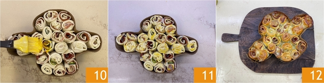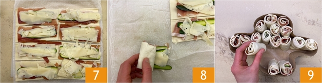 Vervollständigt die Füllung mit den Fontina-Scheiben 7. Rollt dann jedes Stück zu kleinen Röllchen auf 8 und setzt sie in die Colomba-Form, dicht nebeneinander und leicht am Boden angedrückt 9, dabei lasst etwas Abstand zwischen den Röllchen, da sie beim Backen aufgehen.