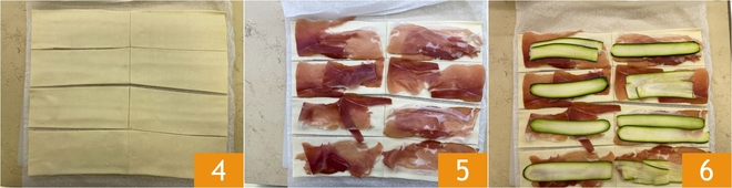 Schneidet Streifen von etwa 6 cm Breite, so dass ihr aus jeder Rolle insgesamt 8 Rechtecke erhaltet 4. Legt auf jeden Streifen eine Scheibe Speck 5, dann darauf eine Zucchinenscheibe 6.