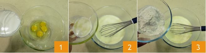 Um die Crêpes mit Pfifferlingen und Speck zuzubereiten, beginnen Sie mit dem Schmelzen der Butter bei sehr niedriger Hitze. Lassen Sie sie abkühlen, dann geben Sie die Milch zu den Eiern 1, schlagen Sie mit dem Schneebesen und fügen Sie die abgekühlte geschmolzene Butter hinzu 2. Fügen Sie das Mehl hinzu 3