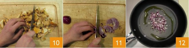 Gehen Sie zur Vorbereitung der Pilze über: Sie können sie mit einem trockenen oder leicht feuchten Tuch reinigen, dann mit dem Messer hacken 10. Schneiden Sie den Speck in Würfel, schälen und hacken Sie auch die Zwiebel 11. Geben Sie einen Schuss Öl in eine Pfanne und braten Sie die Zwiebel einige Minuten bei niedriger Hitze an 12, dabei gelegentlich umrühren, bis sie weich ist.
