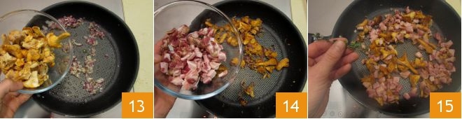 Fügen Sie die Pilze hinzu 13. Mischen Sie und geben Sie auch den Speck in Würfeln hinzu 14, die abgezupften Thymianblätter 15, Salz und Pfeffer nach Geschmack. Kochen Sie etwa 5-6 Minuten lang: Der Speck sollte knusprig und die Pilze weich sein.