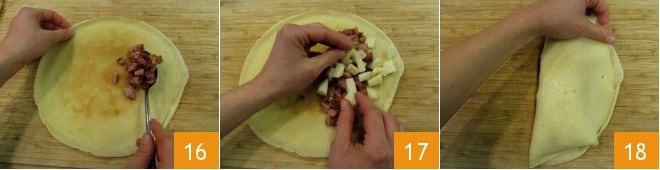 Sobald die Mischung fertig ist, lassen Sie sie leicht abkühlen und füllen Sie die Crêpes: Geben Sie Pilze und Speck auf eine Hälfte 16, fügen Sie die Fontina-Würfel hinzu 17, dann klappen Sie zu einem Halbmond 18.
