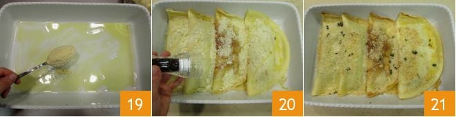 Fetten Sie eine Auflaufform mit einem Schuss Öl ein und geben Sie etwa zwei Esslöffel Semmelbrösel hinein, um den Boden zu bedecken 19. Legen Sie die Crêpes nebeneinander, geben Sie den Parmesan darüber, einen Schuss Öl, Pfeffer 21 und noch ein paar Thymianblätter. Backen Sie im vorgeheizten statischen Ofen bei 190° für etwa 10 Minuten. Sobald sie aus dem Ofen kommen, sind Ihre herzhaften Crêpes mit Pfifferlingen und Speck servierfertig!