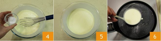 und das Salz 4 und mischen Sie alles mit dem Schneebesen: Sie sollten eine glatte Mischung ohne Klumpen erhalten 5. Erhitzen Sie eine Crêpe-Pfanne mit einem Durchmesser von etwa 22 cm (oder eine große Pfanne mit doppeltem Boden), fetten Sie sie mit sehr wenig Butter ein, um die Oberfläche zu bestreichen, und geben Sie eine Kelle Teig in die Mitte 6;