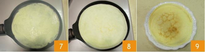 verteilen Sie ihn gleichmäßig mit dem speziellen Crêpe-Verteiler oder durch Drehen der Pfanne 7. Lassen Sie die Crêpe etwa zwei Minuten backen, bis der Boden goldbraun ist, dann drehen Sie die Crêpe vorsichtig um und backen Sie auch die andere Seite 8. Stapeln Sie die fertigen Crêpes auf einem Servierteller 9, dann decken Sie sie mit Frischhaltefolie ab und stellen Sie sie beiseite.