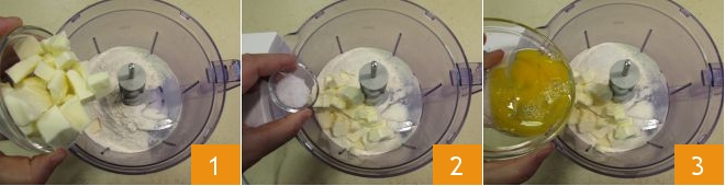 Um die herzhafte Feigentarte zuzubereiten, beginnt mit dem Salziger Mürbeteig: Gebt Mehl, die kalte Butter aus dem Kühlschrank 1, grobes Salz 2 und schließlich das Ei 3 in den Mixer.
