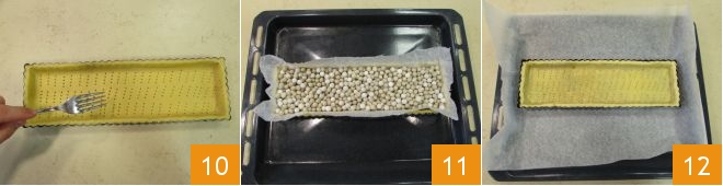 Stecht den Boden mehrmals mit den Zinken einer Gabel ein 10 und bedeckt ihn mit einem zerknüllten Blatt Backpapier. Füllt die Form mit Keramik-Backkugeln oder getrockneten Hülsenfrüchten und führt das Blindbacken durch: backt im vorgeheizten Backofen (Ober-\/Unterhitze) bei 200 °C für 15 Minuten 11, entfernt danach sowohl das Papier als auch die Kugeln und backt weitere 10 Minuten, anschließend noch 2–3 Minuten unter der Grillfunktion 12.