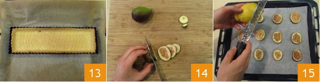 So wird der Boden der herzhaften Tarte gleichmäßig goldbraun und innen durchgebacken 13. Lasst ihn auskühlen und bereitet die kandierten Feigen zu. Nachdem ihr sie gewaschen und abgetrocknet habt, schneidet ihr sie in Scheiben von etwa 7–8 mm Stärke 14. Legt die Feigenscheiben auf ein Backblech mit Backpapier und aromatisiert sie mit der Schale einer halben Zitrone 15.