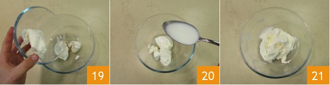 Nun bereitet die Creme zu: Vermischt in einer Schüssel den streichfähigen Frischkäse und die Robiola 19, löst das Ganze mit einem Esslöffel Milch 20 und rührt, bis eine gleichmäßige Masse entsteht 21.