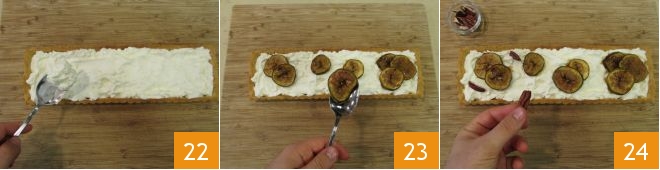 Füllt die inzwischen abgekühlte Tarte mit der Frischkäsecreme, verteilt sie dabei in unregelmäßigen Löffelportionen, um etwas Bewegung zu geben 22. Garniert mit den Feigen und schichtet einige Scheiben übereinander 23, verteilt die Pekannüsse, einige ganz und andere grob gehackt 24,
