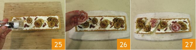 und würzt alles mit einer Prise Pfeffer 25. Vollendet das Gericht, indem ihr zwei Rosen aus Prosciutto formt 26 und eure Feigentarte ist fertig: guten Appetit 27!