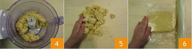 Schaltet den Mixer ein, um alles zu einer kompakten Masse zu verarbeiten 4, dann gebt die Mischung auf die Arbeitsfläche 5 und formt einen Teigfladen. Wickelt ihn in Frischhaltefolie und lasst ihn mindestens eine Stunde im Kühlschrank ruhen 6.
