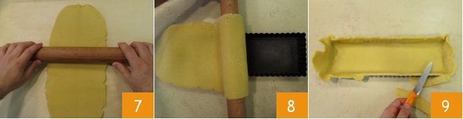 Nach der Ruhezeit nehmt die Füllung heraus und rollt den Teig auf einer leicht bemehlten Arbeitsfläche mit dem Nudelholz 7 aus, bis ein Rechteck von etwa 0,5 cm Stärke entsteht. Legt eine rechteckige Form von 35x11 cm aus, indem ihr den Teig direkt in die Form einlegt und dabei aufrollt und ausbreitet 8. Drückt den herzhaften Mürbeteig gut an und schneidet die überstehenden Ränder mit einem kleinen Messer ab 9.