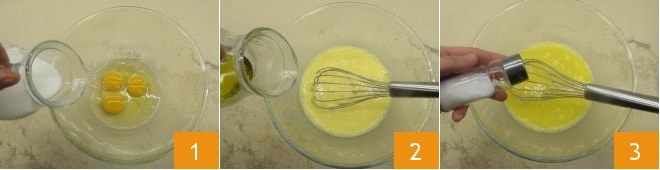 Der herzhafte Fenchel-Kuchen ist ein Rezept, das aus der Wiederverwendung übrig gebliebener gratinierter Fenchel entstanden ist; wenn Sie den Fenchel nicht schon fertig haben, können Sie ihn nach dem Rezept der gratinierten Fenchel mit den in diesem Blatt angegebenen Mengen zubereiten. Kümmern Sie sich dann um den Teig: Geben Sie die Eier und die Milch in eine Schüssel 1, schlagen Sie die Mischung mit dem Schneebesen, dann fügen Sie das Öl hinzu 2 und salzen 3.