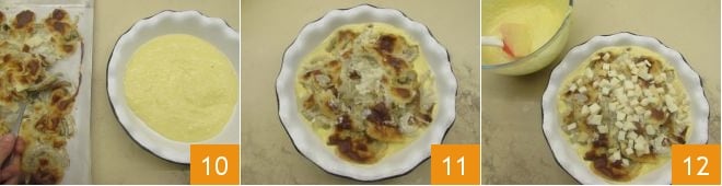 gießen Sie etwas weniger als die Hälfte des Teigs auf den Boden und verteilen Sie ihn so, dass er die gesamte Oberfläche bedeckt 10. Fügen Sie nun die Füllung aus übrig gebliebenem gratiniertem Fenchel hinzu 11 und 2/3 des Scamorza 12.